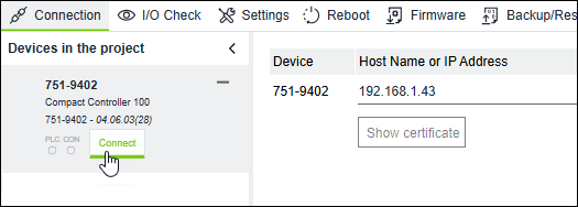 If you want to use a port other than the default port 443, append the port number you want to the IP address or hostname, separated by a colon, for example: 192.168.1.22:1000. - In the “Devices in Project” area, click the [Connect] button.