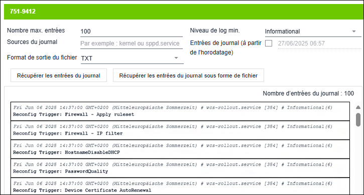 [Récupérer les entrées du journal] | Affiche les entrées Log en fonction de la configuration et du filtre sélectionné. |