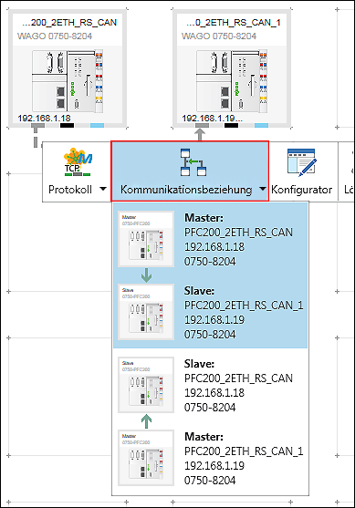 Tipp: Sie können die Geräterollen Master und Slave bei Bedarf auch nachträglich ändern. Klicken Sie dazu auf den Modbus-Konnektor eines der beiden Geräte und anschließend auf [Kommunikationsbeziehung]. Die aktuelle Kommunikationsbeziehung ist blau hinterlegt und wird an erster Stelle angezeigt. Bei Bedarf wählen Sie einen anderen Eintrag aus.