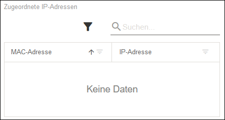 Zugeordnete IP-Adressen | Listet alle Geräte, die per DHCP (als „DHCP Client“) eine IP-Adresse angefragt und zugewiesen bekommen haben. Für die Geräte werden die Parameter MAC-Adresse und IP-Adresse angezeigt.