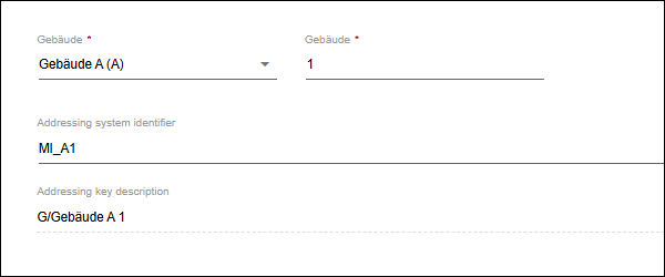 Position within the description | Position of the selected entity under “Addressing key description” (see 8 “ADDRESSING” Tab). Example: An entity of type “Buildings” is selected in the tree structure. The value “1” is assigned to it at this point. Therefore, this entity is located under “Addressing Key Description” in position 1.