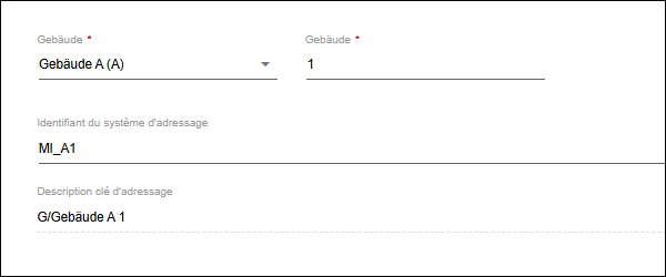 Position dans la description | Position de l'entité sélectionnée sous "Description de la clé d'adressage" (voir 8 Onglet « ADRESSAGE »). Exemple : Une entité de type "Bâtiment" est sélectionnée dans l'arborescence. La valeur "1" lui est attribuée ici. Sous "Description de la clé d'adressage", cette entité se trouve ainsi à la position 1.
