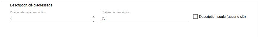 Préfixe de description | Chaîne de caractères qui précède la description de la clé d'adressage. Exemple : "Étage" ou "G/" ou "in" | |