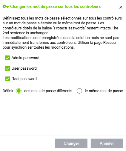 Modifier tous les mots de passe | Modifie les mots de passe d'un ou plusieurs comptes utilisateurs sur tous les contrôleurs en utilisant un mot de passe identique ou des mots de passe différents générés aléatoirement.